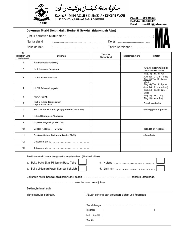 Borang Pengurusan Dokumen Murid Berpindah Sekolah Menengah Atas Pdf